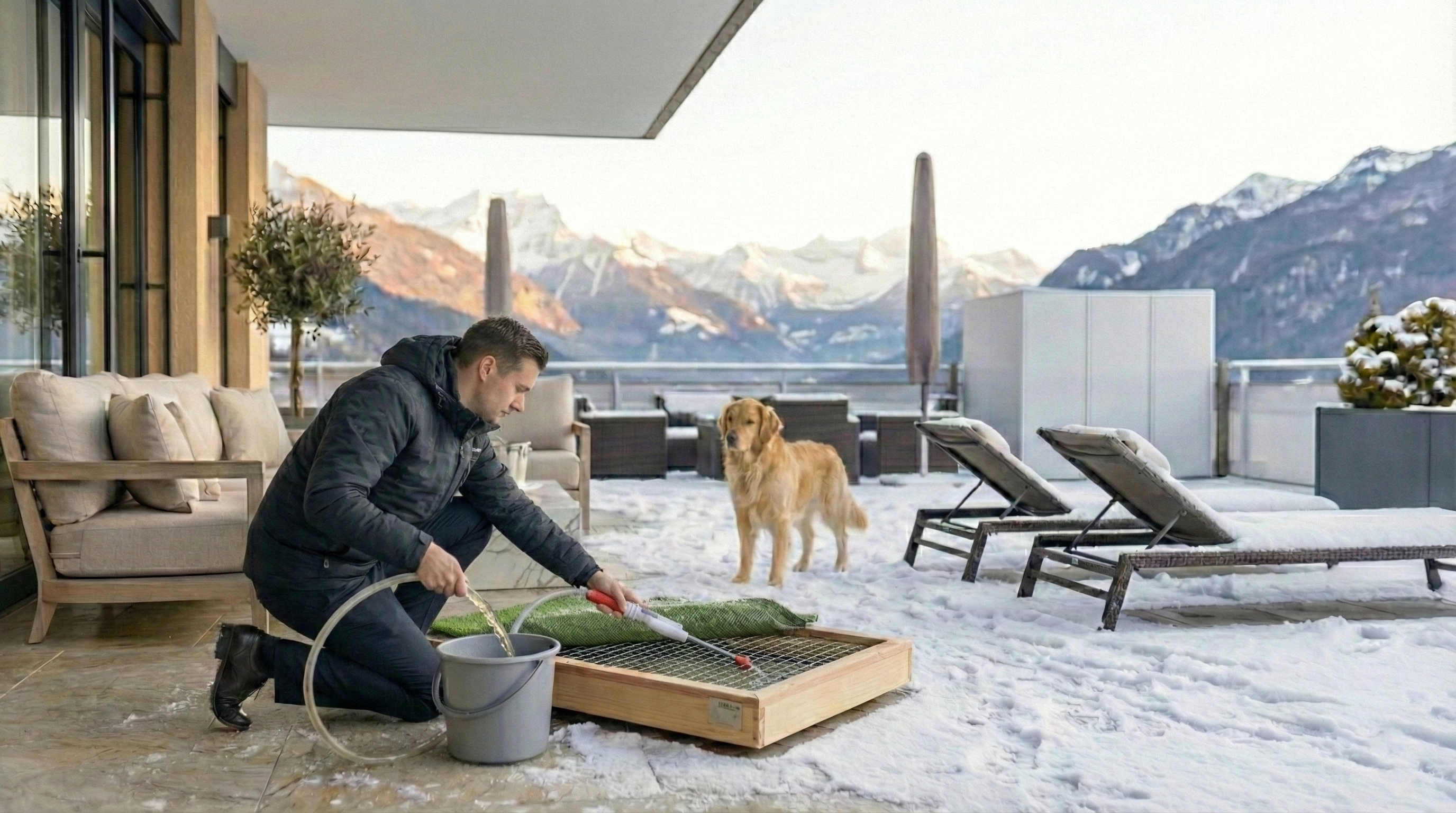 Tiwa (Lagotto Romagnolo) und ihre Besitzer leben in einer Attikawohnung. Morgens „schnell“ runter ins Grüne? Oft eine logistische Expedition. Das HundeWC auf der Terrasse hat den Alltag für Mensch und Tier massiv entspannt.