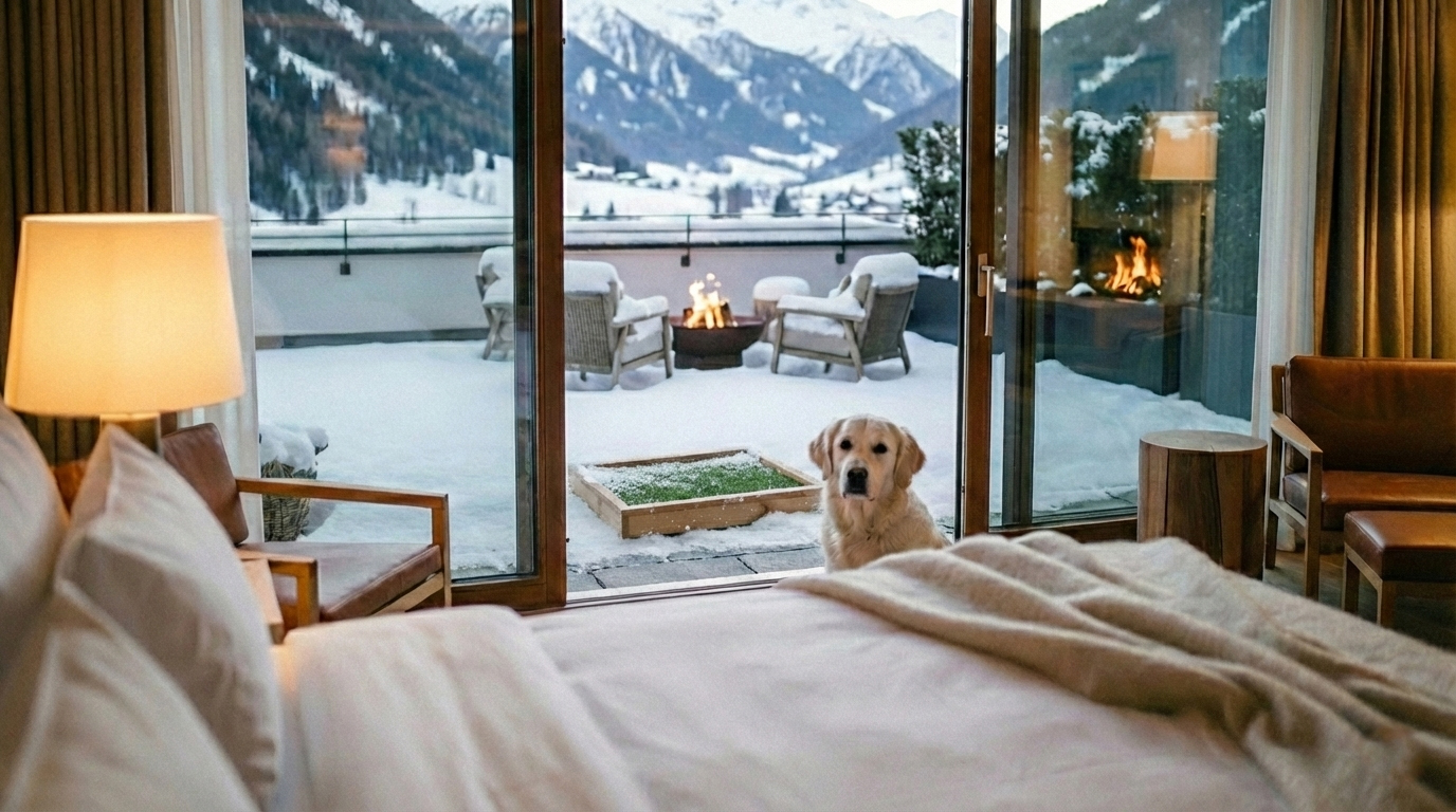Hündin Monza sitzt entspannt auf einem HundeWC, also einer hochwertigen Hunde-Toilette aus Douglasienholz auf einem modernen Balkon bei Abenddämmerung.